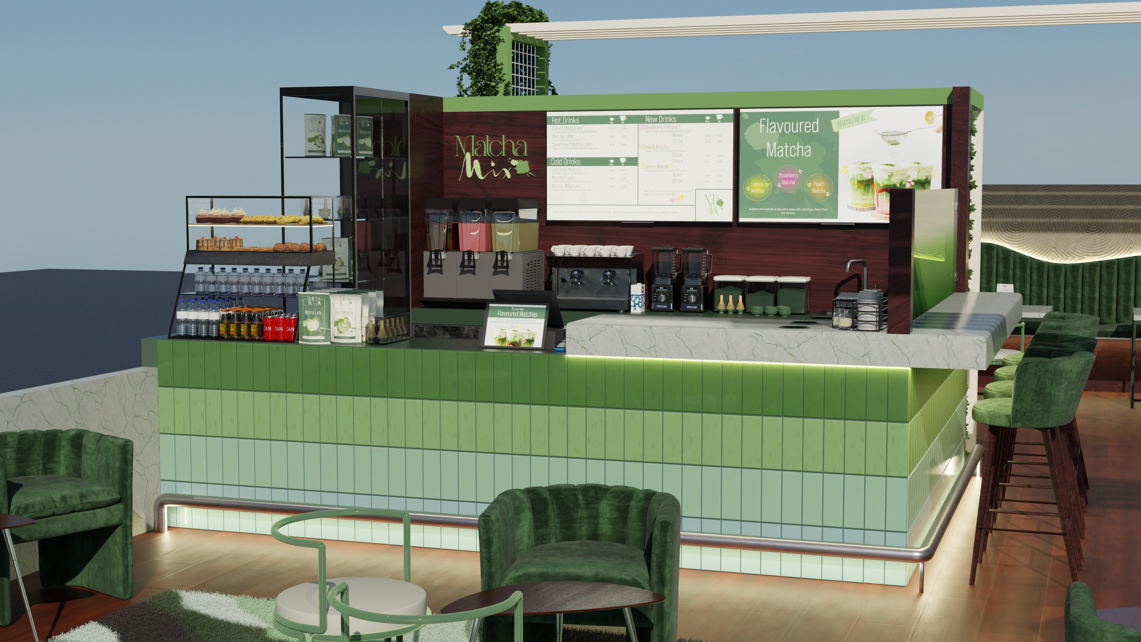 As a passion and skill showcase project, Matcha Mix is a brief that was personally developed. Below are renders of a centre court store or popup venue.